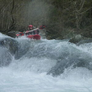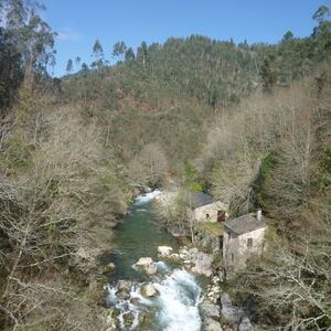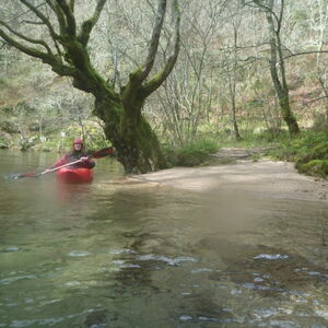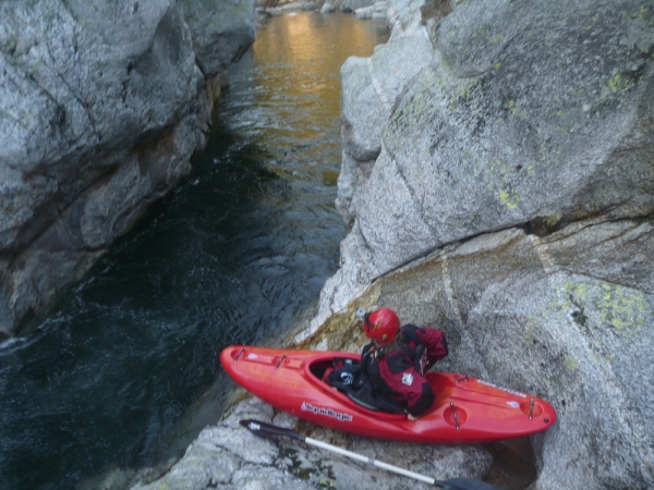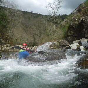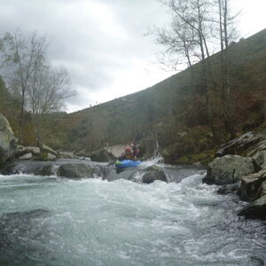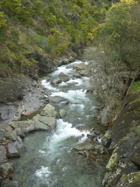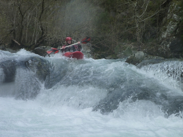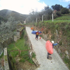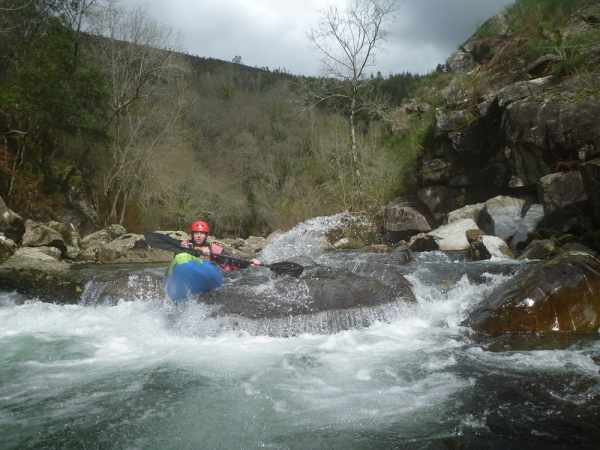 Am nächsten Tag sollte es mit Pires paddeln gehen. Da dieser jedoch einen selstamen Biorythmus hat und bis 12 Uhr mittags schläft, hatten wir vormittags frei. Prompt entschlossen wir uns zu einer kleinen Wanderung( mit 700 Höhenmetern), und ehe wir es uns versahen, war es halb zwei. Bis wir dann mit Pires auf dem Louredo im Boot saßen, war es vier Uhr. Und auch in Portugal muss die Sonne irgendwann untergehen! Mit fünf Umtragestellen, Siphons, der drohenden Dunkelheit im Nacken und dann noch Niederwasser-also Steineschrubben- wurde uns, je länger die Fahrt dauerte, immer mulmiger im Magen. Pires Aussage \\'Only 100 Meters\\' schenkten wir nach einer halben Stunde auch keinen Glauben mehr. Und als dann auch noch der Siphon kam, wo einfach der ganze Fluss unter einen Stein fließt, mit einem Strudel davor, als hätte jemand einen Stöpsel aus der Badewanne gezogen... da wurde uns doch schon arg und bang. Wir kamen gerade so noch mit einem blauen Auge davon Zehn Minuten nachdem wir Aussgestiegen waren, war es zappenduster. Umgezogen haben wir uns im Scheinwerferlicht des Autos... so etwas wird uns sicher eine Lehre sein. Aber das Tamegatal hat auch andere Bäche zu bieten. Der Tamega selbst ist Wuchtwassergenuss pur wenn man die langen Flachwasserpassagen dazwischen in Kauf nimmt. Der Olo ist dagegen eher technisches Traumwasser- keine Siphons, alles fair und mit langem Hals fahrbar.