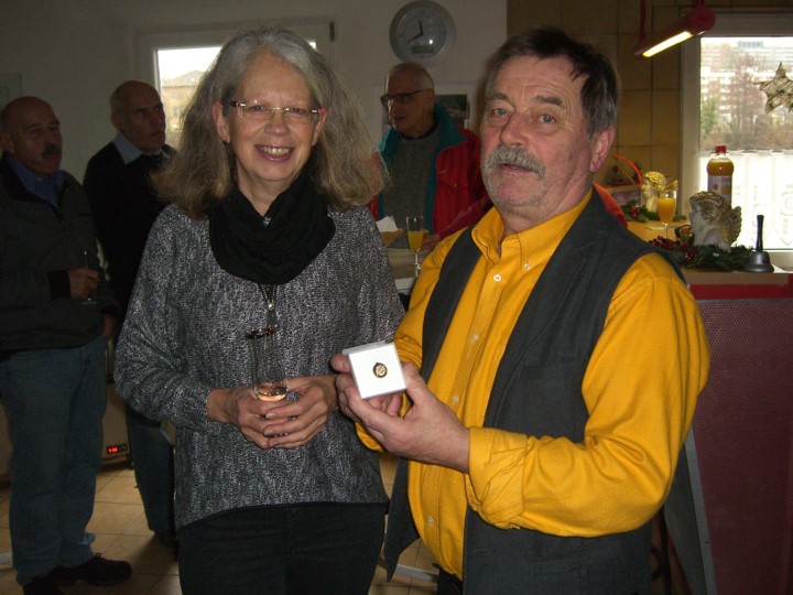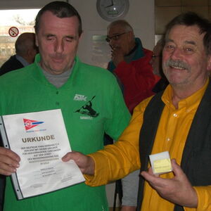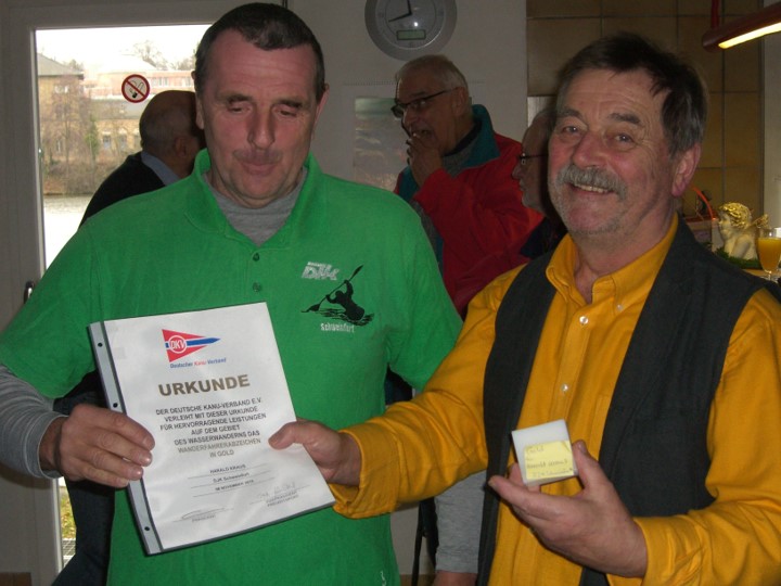 Für besondere Leistungen konnte Klaus auch zwei Wanderfahrer-Abzeichen mit Urkunden des Deutschen Kanu-Verbandes überreichen. Für 5000 km Wanderfahrten bekam Harald das Abzeichen in Gold, Uschi bekam es für 500 km in Bronze. Wir haben herzlich dazu gratuliert und darauf angestoßen.