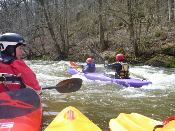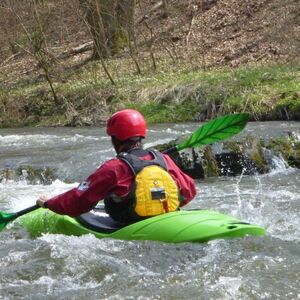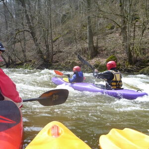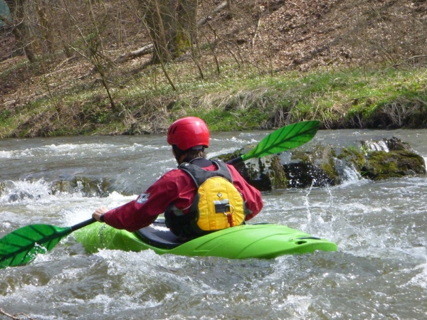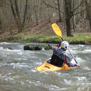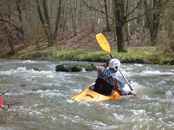 Endlich ging es los und trotz raschem Fluss begann die Weiße Elster erstmal recht lieblich, doch das sollte sich bald ändern. Keine Zeit mehr auf die Landschaft zu achten. Wir hatten in unserer Gruppe eine feste Reihenfolge festgelegt und ich war an 2. Stelle, hinter unserem Führer Klaus. Ein immer lauter werdendes Rauschen und viele weiße Schaumkronen auf den Wellen ließen mich schon ahnen, was jetzt kam: Aufregung, Spannung, gerade Sitzen, immer hinter Klaus her. „... einfach gerade durch...“ die Rufe gingen fast unter in immer tosenderem Rauschen und dann ging es wirklich ab. Adrenalin pur, intstinktives Reagieren, im Augenblick. Die Wellen waren echt hoch, die Hindernisse steinhart. Teilweise waren Boot und Körper völlig unter Wasser, aber der gutmütige „Canyon“ bohrte sich wie ein Torpedo durch die wilde Flut. Das machte Spaß! Das Vereinsboot gab mir ein sicheres Gefühl und die anfängliche Unsicherheit wandelte sich in Euphorie. Jede neue Stufe stellte eine andere Herausforderung dar. Ich sah Klaus ständig im Kehrwasser verschwinden und da ich es fast nie schaffte ihm zu folgen, rauschte ich an ihm vorbei und es waren nur Wortfetzen seiner Rufe die zu mir durchdrangen: „....einfach durch...“ Nun war ich teilweise der erste, das machte irgendwie Angst, aber war gleichzeitig cool. Klaus kam dann immer sehr rasch hinterher. Jetzt wollte Bommel mir doch endlich mal Kehrwasser fahren beibringen und wieß auf einen netten Stein in der Mitte des Flusses. Die Strömung war minimal und ich eierte tatsächlich ins Kehrwasser hinter dem Stein. Dort parkte ich recht Stolz, bis der Topo Duo neben mir ins Kehrwasser einscherte. Völlig unvorbereitet auf diese Aktion trieb ich so blöd auf ihn zu, dass er mich voll breitseitig rammte. Ich hing nun in Strömung, Kehrwasser und unter seinem Bug gleichzeitig und es machte nur noch Platsch. Trotz Neopren, schockiert von dem kalten Wasser, war an einen Versuch der Rolle nicht zu denken. Kurz darauf stand ich mit Paddel und Boot sicher am Ufer und machte die wertvolle Erfahrung, dass Neopren tatsächlich wärmt. Ich war bisher noch nie aus einem Kajak gestürzt und auch noch nie mit Neopren im kalten Wasser. Die Angst machte mich bisher immer etwas steif, aber die Erfahrung, dass reinfallen, aussteigen und nass werden gar nicht schlimm sind, sorgte für Entspannung und noch mehr Fahrspaß. Ein Highlight war dann noch das Hinabfahren des letzten Wehres, wo am Schluss mit hoher Geschwindigkeit eine große Welle durchfahren wurde, wo man wirklich völlig unter Wasser war.